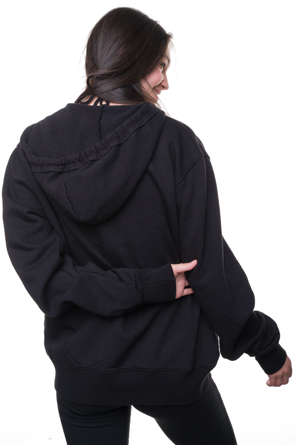 - Hood with matching fabric drawstring and raw edge trim